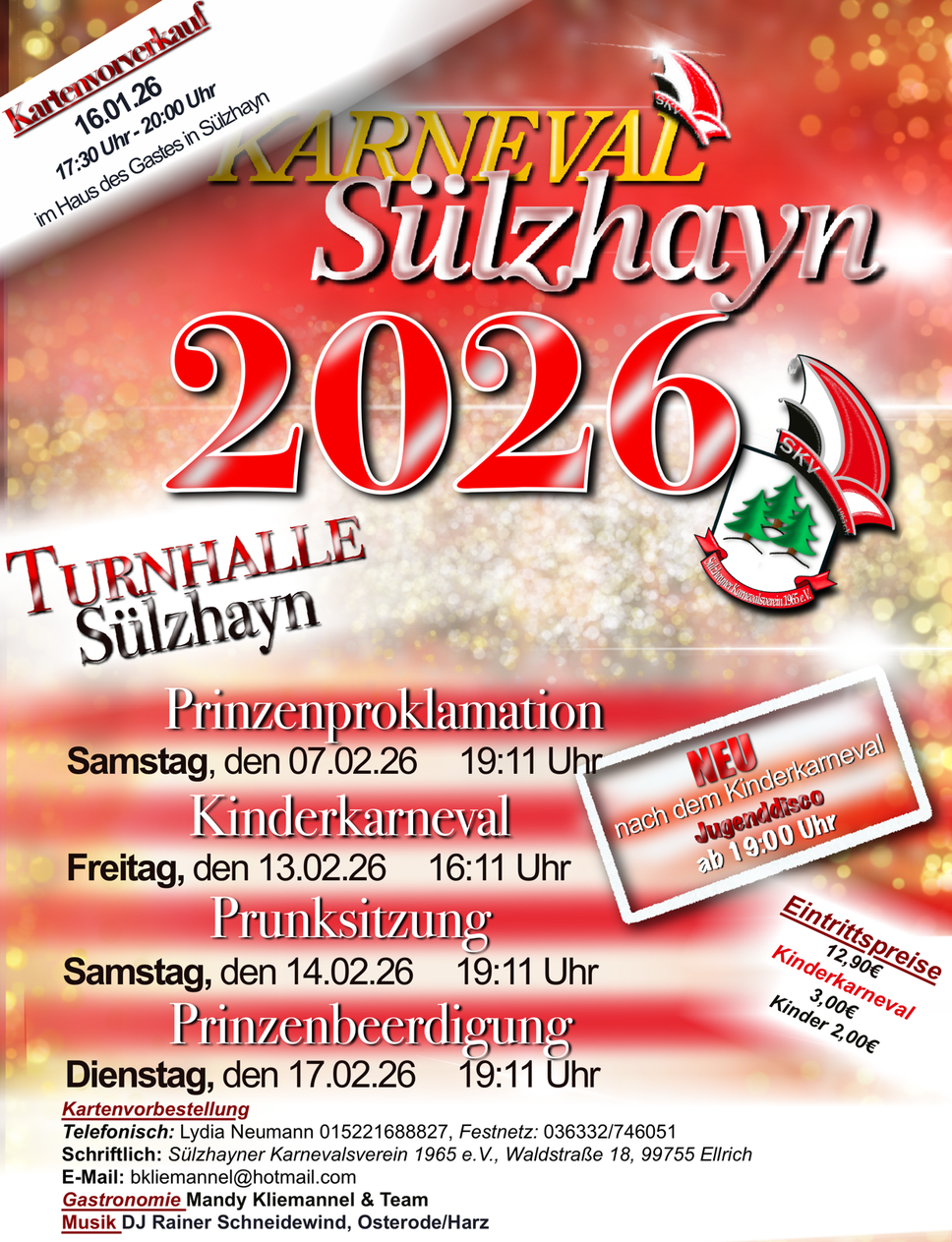 Der Countdown für die 54. Saison des Sülzhayner Karnevalsvereins läuft. Die Mitglieder des SKV sind bereits seit Monaten am Proben und fiebern der bevorstehenden Saison entgegen. Tanzgruppen, Sänger, Büttenredner, Männerballett sowie unsere Jüngsten legen sich mächtig ins Zeug, um auch in diesem Jahr ein tolles, stimmungsvolles und abwechslungsreiches Programm zu präsentieren. Am 23. Februar startet der SKV pünktlich um 19.11 Uhr im Haus des Gastes, Café am Park in die närrische Jahreszeit. Auch in diesem Jahr weiß nur der Präsident des SKV, Bernd Kliemannel und das Paar selbst, wer an diesem Abend als neues Prinzenpaar die Regentschaft über das närrische Sülzhayner Volk übernehmen wird. Am 2. März geht es weiter mit der Prunksitzung, sowie am 3. März mit dem Kinderfasching, welcher um 15.00 Uhr beginnt. Mit der berühmten Prinzenbeerdigung am 5. März endet die Saison. Alle Abendveranstaltungen starten um 19.11 Uhr im Haus des Gastes in Sülzhayn. Kartenvorbestellungen sind telefonisch möglich bei Elvira Buchelt (036332/2134 8), schriftlich (Sülzhayner Karnevalsverein 1965 e.V., Waldstraße 18, 99755 Ellrich) oder per Mail hier.